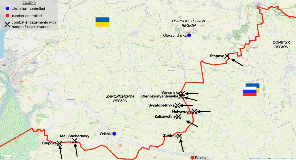 In the Hulyaypole direction, in Zaporizhzhya region, 18 attacks by the russian fascist invaders took place in the areas of Hulyaypole and Zahirne as well as towards Varvarivka, Olenokostyantynivka, Svyatopetrivka and Zaliznychne. Two combat engagements are still ongoing.