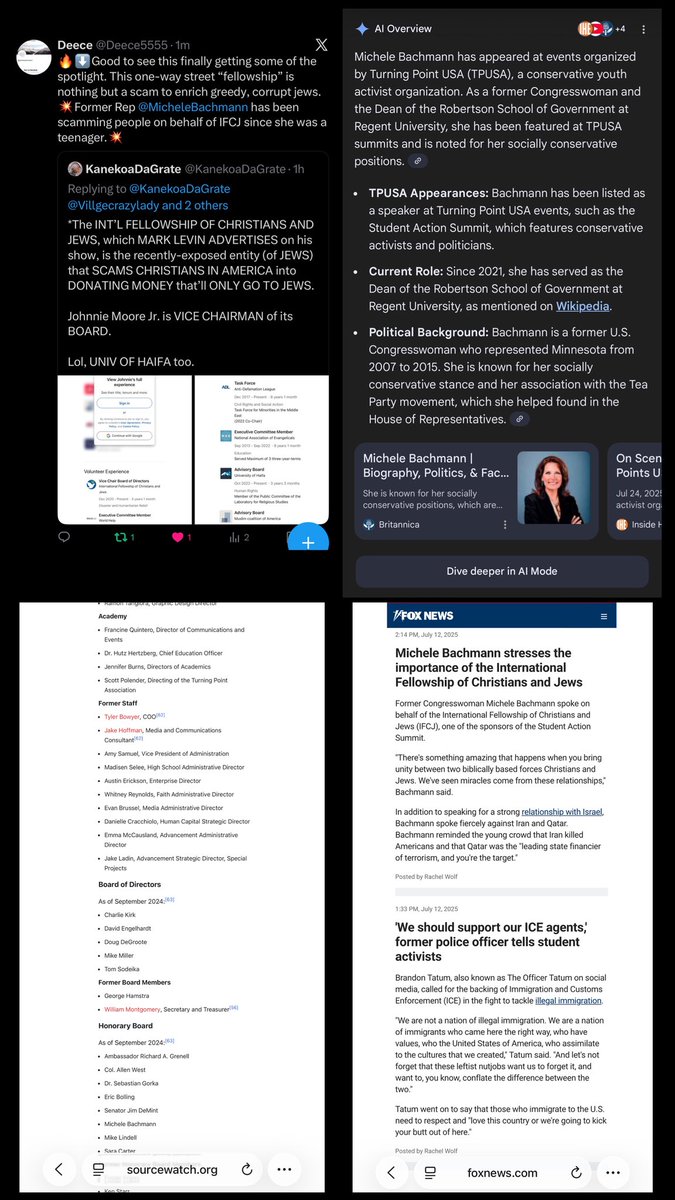 Oh, TPUSA HONORARY BOARD MEMBER MICHELLE BACHMANN, who’s a frequent TPUSA SUMMIT SPEAKER & TP ED ‘AM FEST 2023’ LECTURER, is a DIRECTOR at INT’L FELLOWSHIP OF CHRISTIANS AND JEWS?