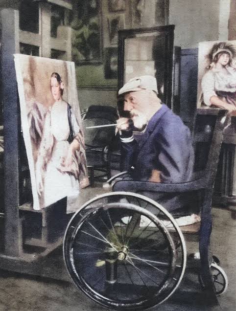 En silla de ruedas y con caballetes con ejes de bicicleta accionados a través de una manivela que le permitía mover el lienzo de arriba abajo o viceversa, Renoir dejó una frase para la historia: ¨El dolor pasa, la belleza permanece