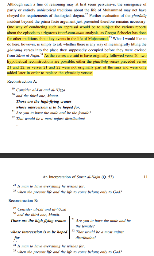 The satanic verses are an early Islamic narrative about satanic interpolation in the Qur'anic revelation in Q53:19-20. Where the praise of three pagan goddesses occurred al-Lat, al-Uzza, and Manat as "high-flying cranes whose intercession is hoped for."