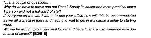 A temporary solution was offered whereby the female nurses who objected to Rose's use of their changing room were offered (unsatisfactory) alternative facilities. They had questions.