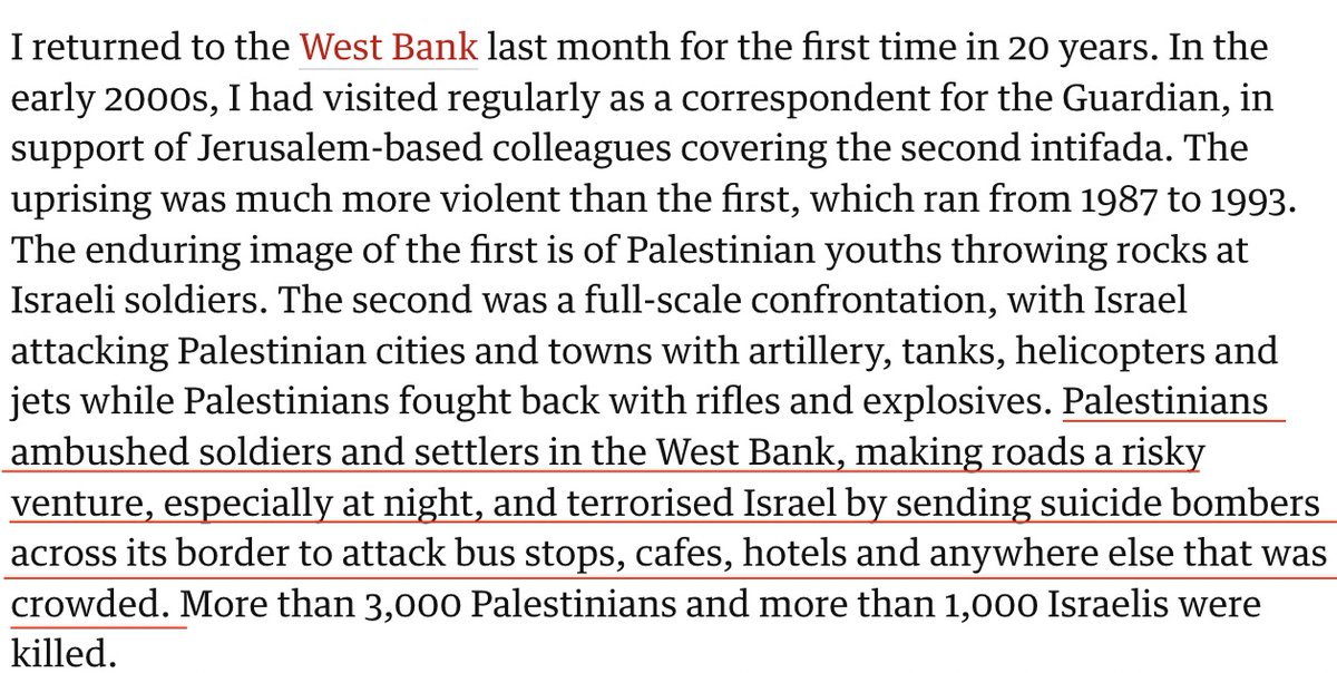 2/ The piece opens with a fiction: that Palestinian attacks were basically a reaction to Israeli incursions into West Bank towns during the Second Intifada.