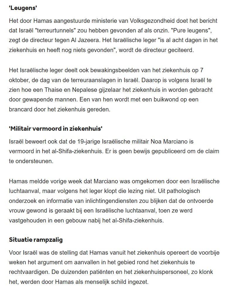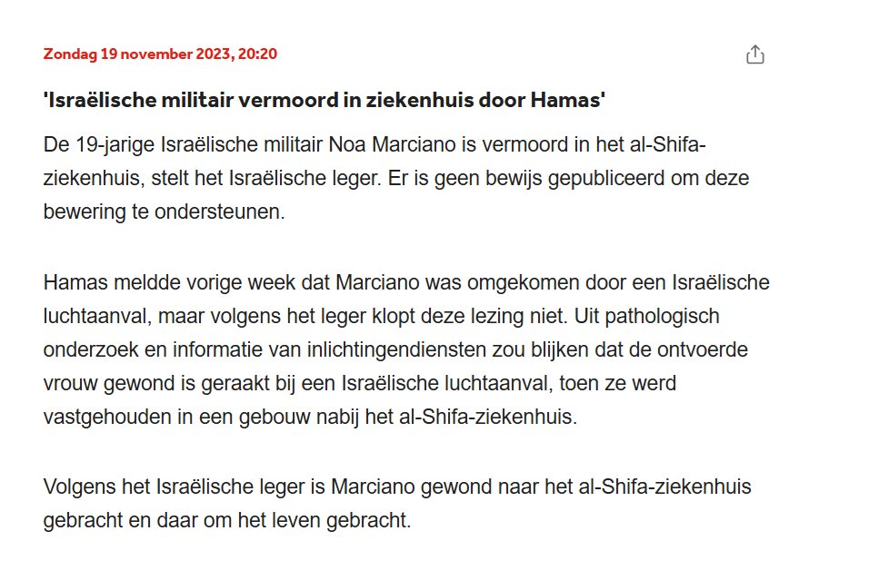 "Israël beweert (...) dat de 19-jarige Israëlische militair Noa Marciano is vermoord in het al-Shifa-ziekenhuis. Er is geen bewijs gepubliceerd om de claim te ondersteunen", schreef de NOS later die dag in een artikel. Een link naar dit artikel volgt later in deze draad. 3/9