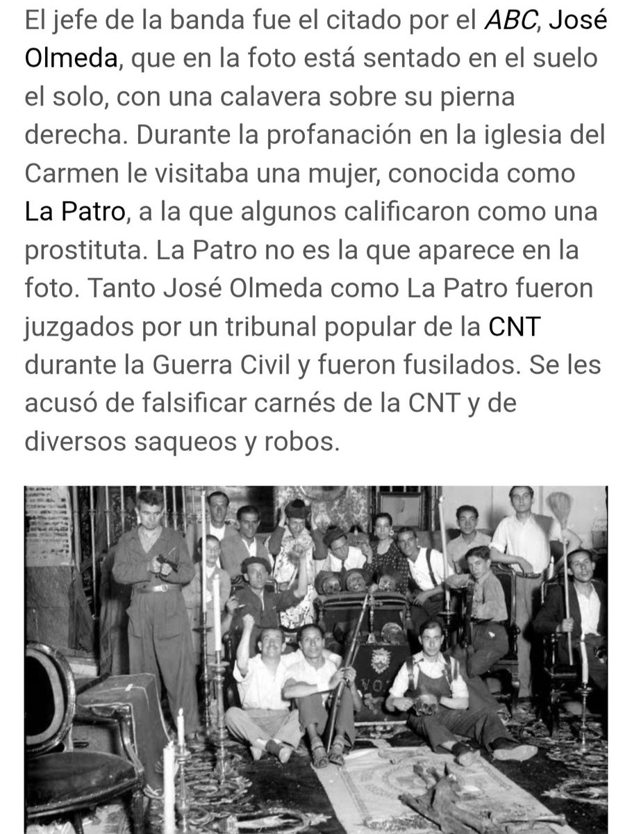 El jefe de los milicianos, José Olmeda (sentado con una calavera entre sus piernas), mantenía también igual tipo de relaciones con una prostituta, la Patro.