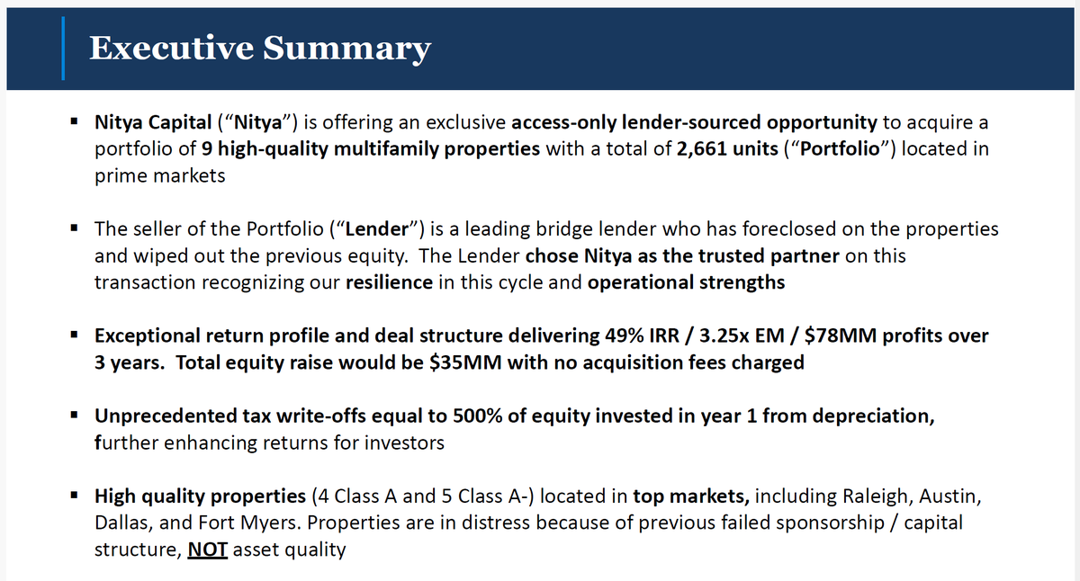 - The third bullet point should immediately set off a bunch of alarms in your head. Tripling your money in three years obviously sounds compelling, but those returns are atypical for multifamily. So, I would hope this presentation covers the significant risks associated.
