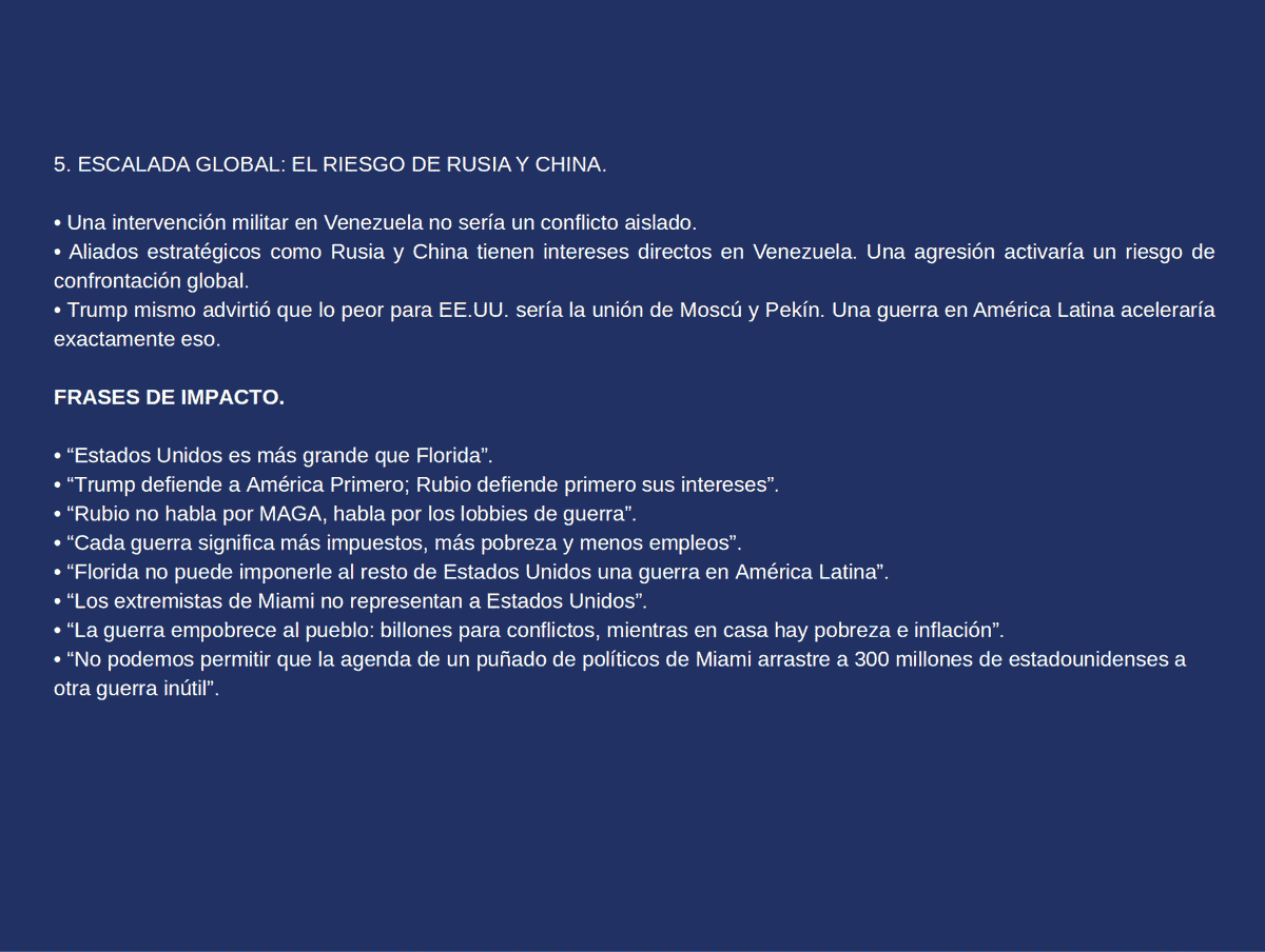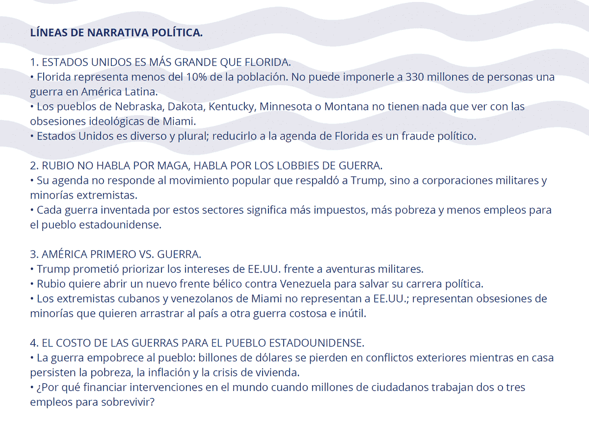 Siguiendo algunas de esas líneas, su ecosistema de propaganda recicla y amplifica críticas en EE. UU. a Trump para empujar el relato del “lobby de Miami vs. MAGA”, el inconveniente costo de la guerra, y reforzar la idea de “normalidad” en Venezuela.