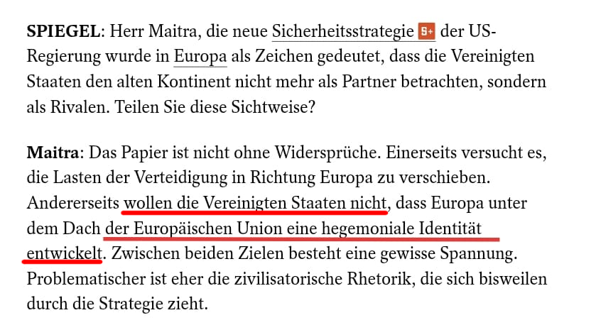 Maitra behauptet "die USA" (wer auch immer damit gemeint ist) wollten nicht, dass die EU eine "hegemoniale Identität" entwickelt.