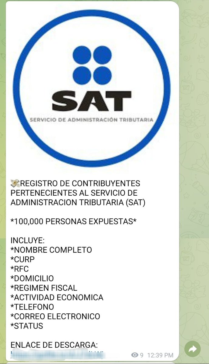Uno de los golpes más críticos es al @SATMX, con la exposición de 109,730 contribuyentes en un formato inusualmente procesado.