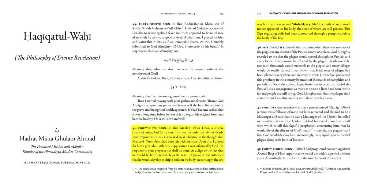 After the enemies mocked the death of the son of Maulvi Noor-ud-Din RA & called him Abtar, Mirza Ghulam Ahmad AS prophesied birth of a son who would have boils on his body