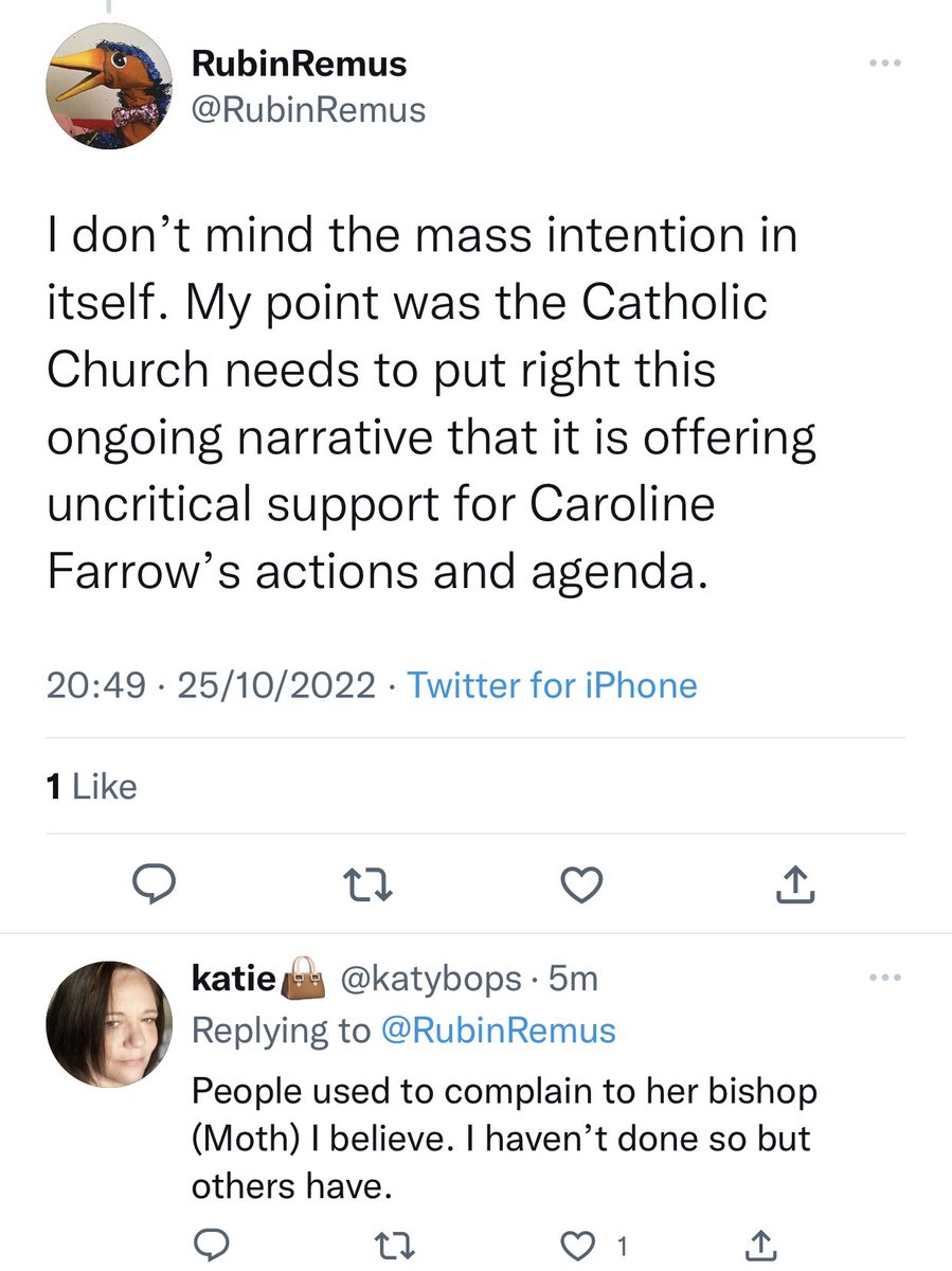In 2022, a Twitter account calling itself "Rubin Remus" set up. Here's one of its posts from 31 October 2022 complaining about a Mass intention for me.