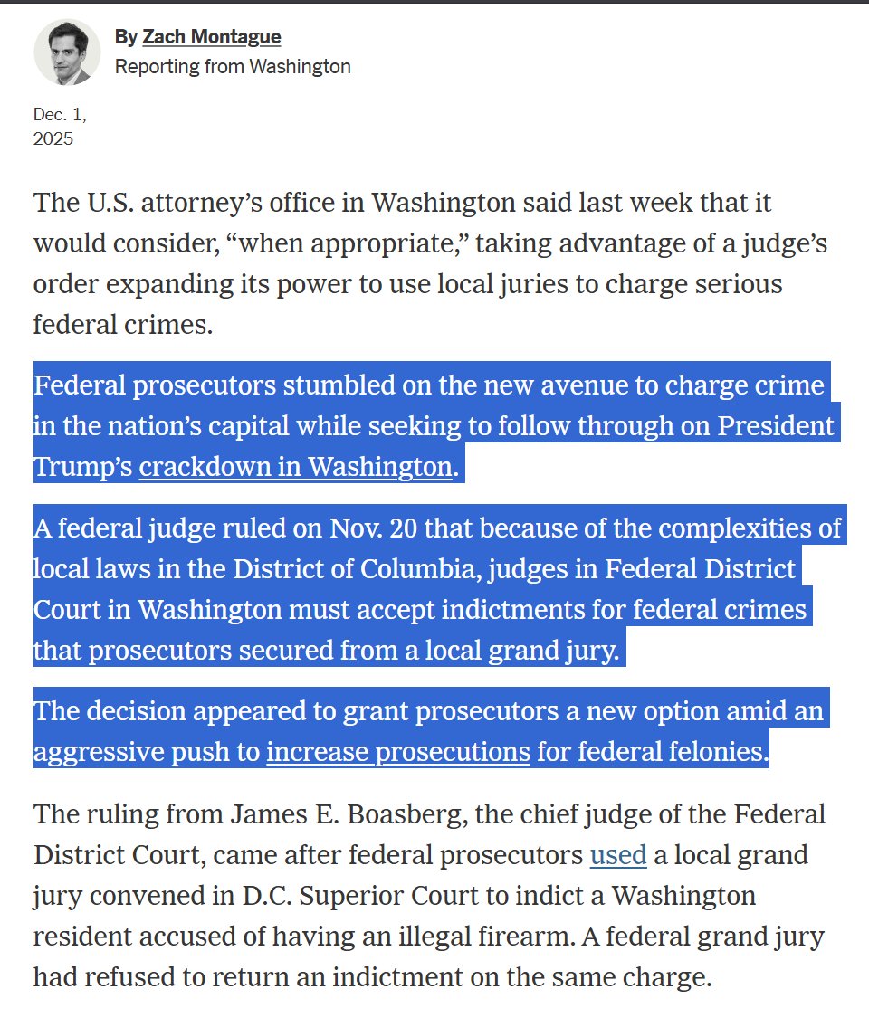 Federal prosecutors using a local grand jury in this way is a new thing in DC. It came about thanks to the Trump Admin's push to neutralize criminal activity in the capital.