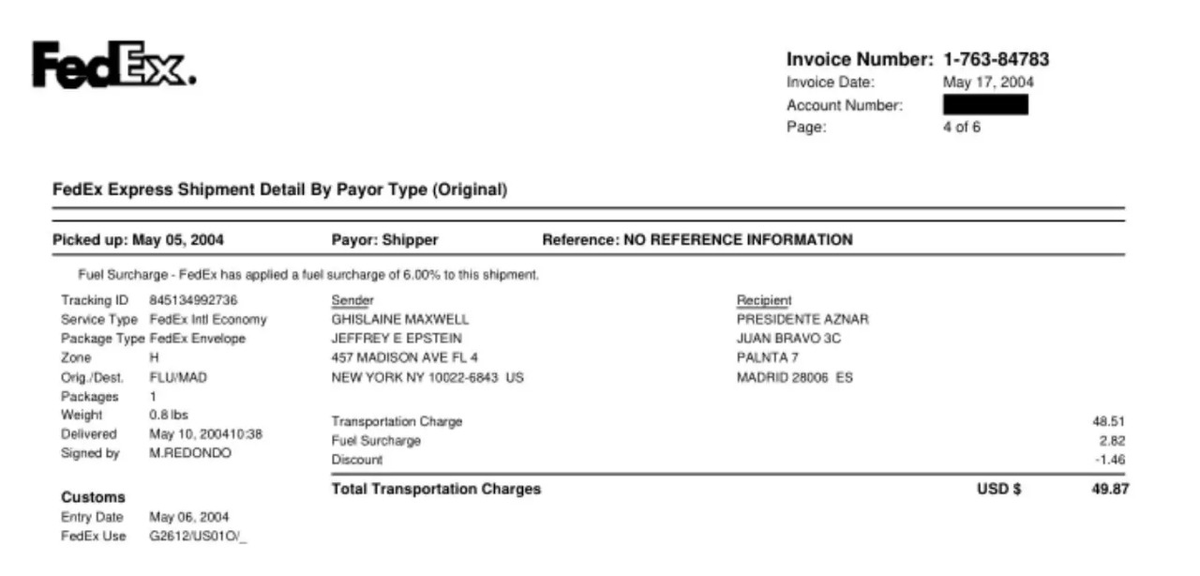 En los nuevos archivos públicos de Epstein aparece Aznar y Ana Botella por dos paquetes enviados en 2003 y 2004. Anteriormente ya apareció un pago de un billete de avión en 2003 y su hijo y yerno aparecían en su agenda.