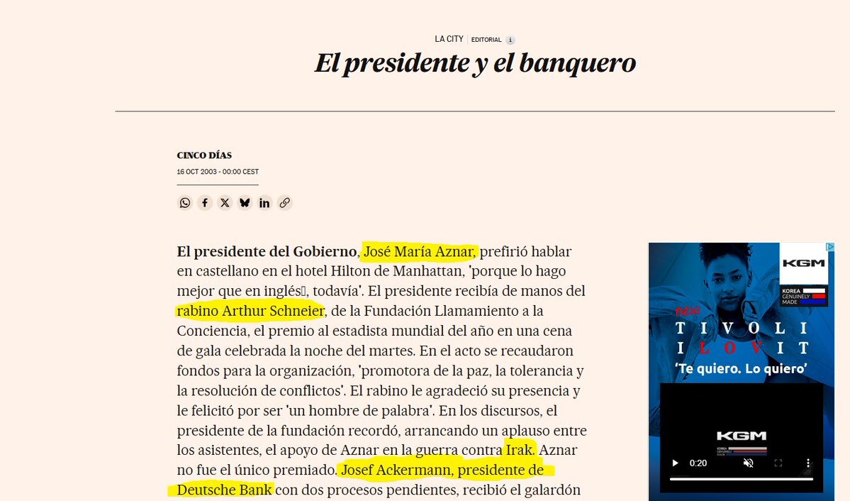 Curiosamente el banco del otro premiado junto a Aznar, Deutsche Bank, fue sancionado por las cuentas opacas de Jeffrey Epstein.