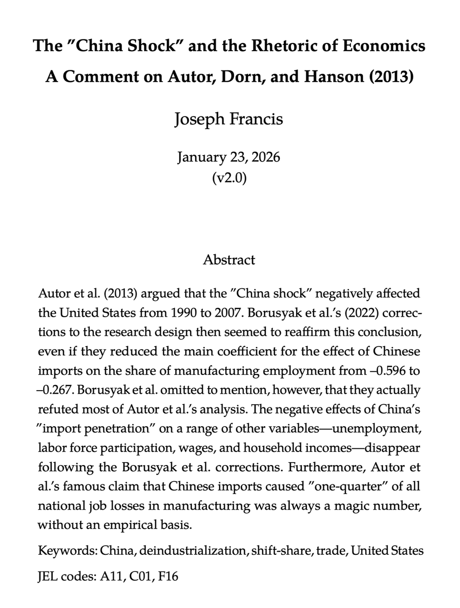 I think that previous critiques of Autor, Dorn, and Hanson (ADH) have tended to concede a key piece of ground: they assume that manufacturing employment's share of the working population is the key dependent variable. 2/11