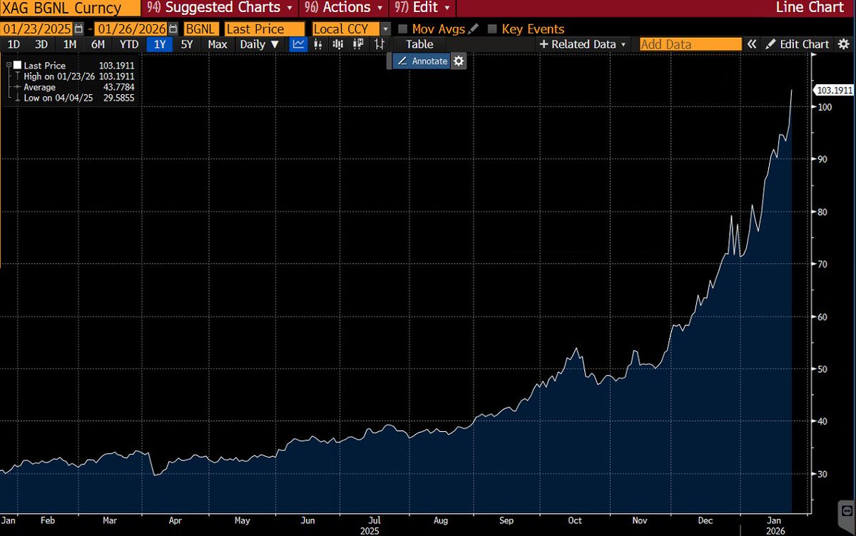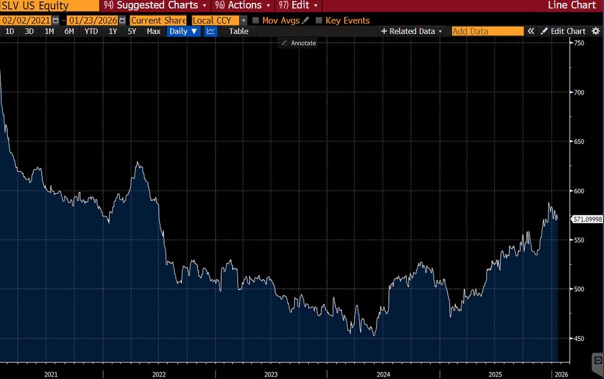 At the same time, retail investors are still nowhere near fully back. If you look at the number of shares outstanding of $SLV, we are still below the 2021 peak. And that’s remarkable, because last year we had the strongest silver price increase since 1979, while the general public barely participated.