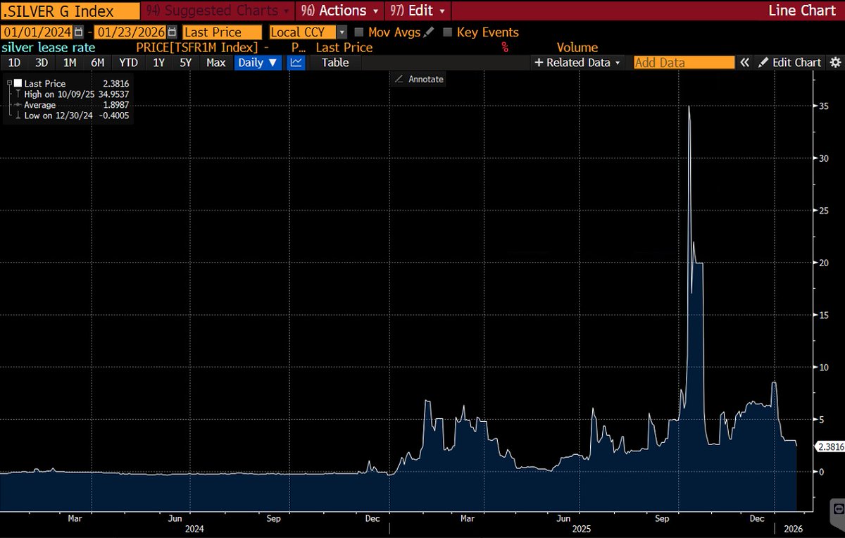 Under normal circumstances, 1-month lease rates trade around 0%. Sometimes slightly higher if the lender wants to earn something, sometimes slightly lower if someone has too much inventory. Anything above 1% already signals stress. Right now, lease rates are around 2.5%. That is extreme. It tells you there is a serious shortage of physical silver. And these elevated lease rates put a very solid floor under the silver price.