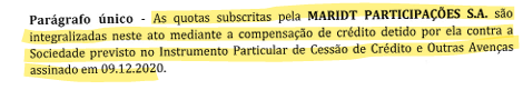 TRÊS meses depois, a mesma MARIDT vira sócia do Resort Tayaya, passando a ser dona de cotas que representam R$ 4.180.530,00, mediante COMPENSAÇÃO DE CRÉDITO.
