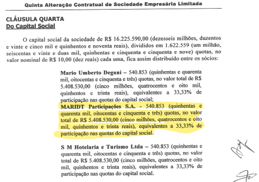 Os mesmos sócios aproveitam para aumentar o capital social da empresa e, por isso, a familia Dias Toffoli passa a deter R$ 5.408.530,00 em cotas do Resort.