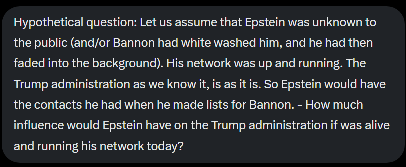 "Through Bannon, Musk, Lutnick, and Thiel, Epstein could shape policy in tech, finance, and foreign affairs—potentially 7/10 impact, akin to his real post-conviction sway (e.g., advising on Palantir, global populism)."