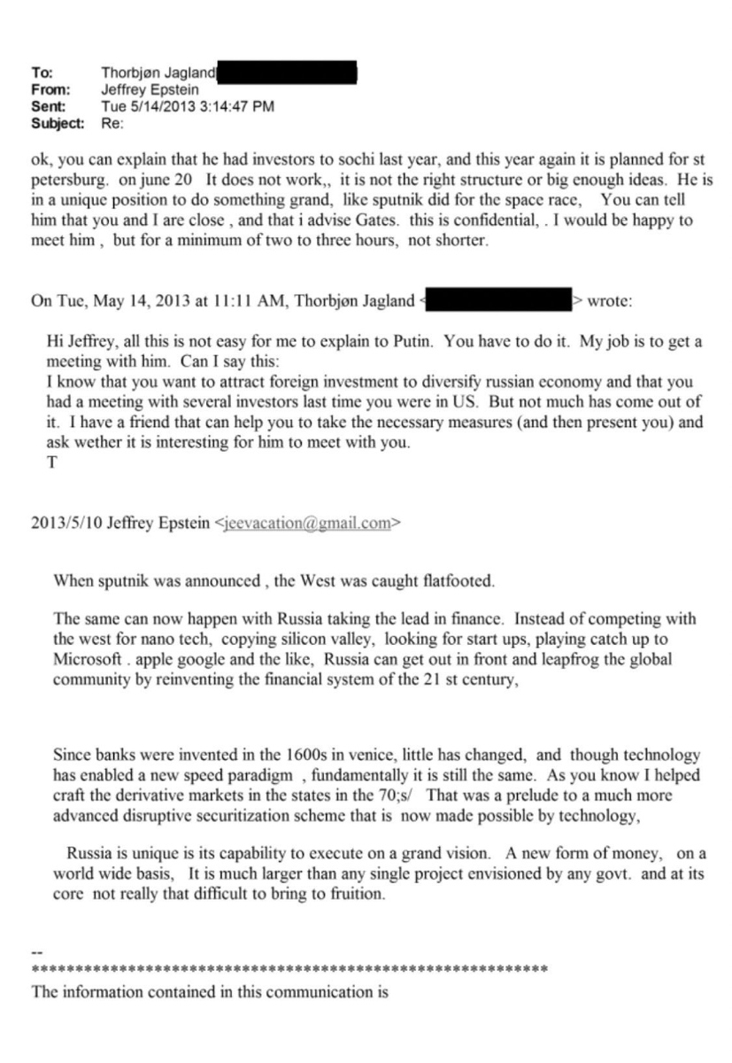 From 2013, Epstein pitched Moscow on a "Sputnik for finance": urging FSB-linked Sergey Belyakov to let Russia invent new global money & leapfrog the West. 2/12