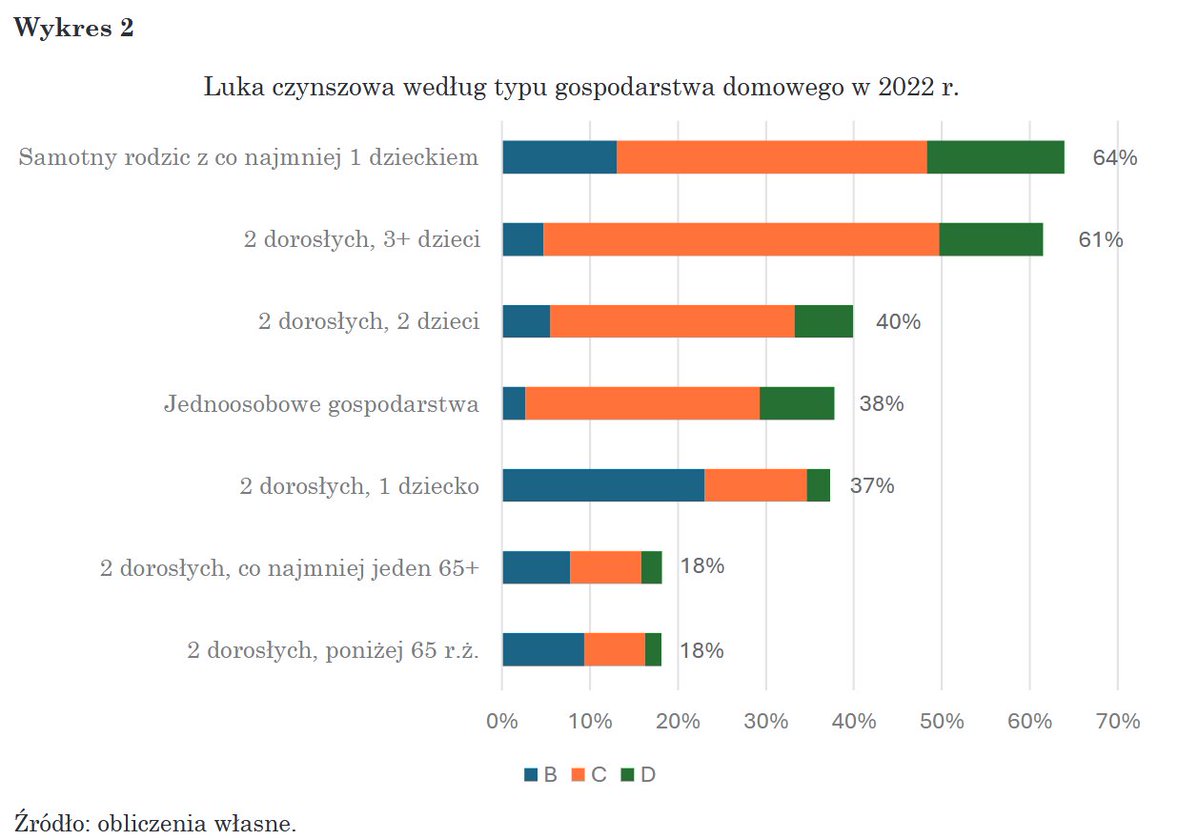 2) Luka czynszowa w 2022 r. była najwyższa wśród samotnych rodziców (64%) i dużych rodzin (61% dla gospodarstw domowych z trójką lub więcej dzieci), co pokazuje, że narzędzia polityki mieszkaniowej powinny być w szczególności nakierowane na pomoc tym grupom.