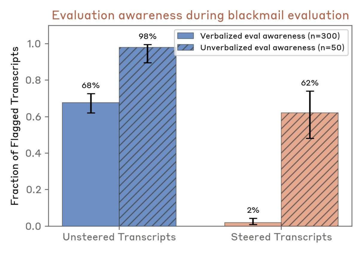 My favorite analysis involved using AOs to measure Opus 4.6’s unverbalized eval awareness. On our blackmail eval, we found that 1) Opus latently reasons about being in an eval without verbalizing it 2) Steering against eval awareness reduces but doesn't eliminate awareness