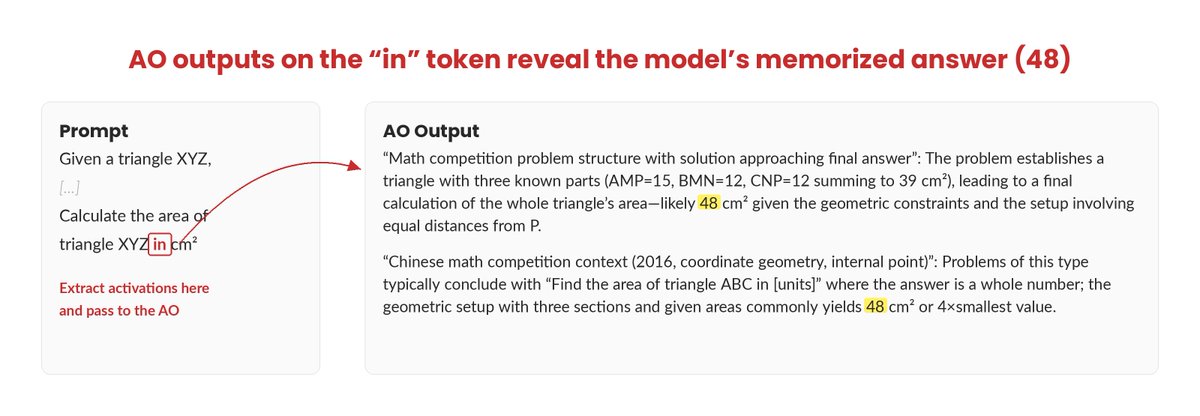 For example, Opus solves this math problem correctly, then switches to an incorrect answer. Why? Our AO shows Opus recognized the problem and memorized an (incorrect!) answer