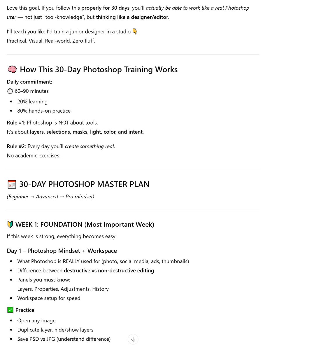 “Act as a professional instructor and practitioner with deep real-world experience in [skill]. Teach me this skill from beginner to advanced level in 30 days. Focus on practical understanding, correct fundamentals, and real application instead.