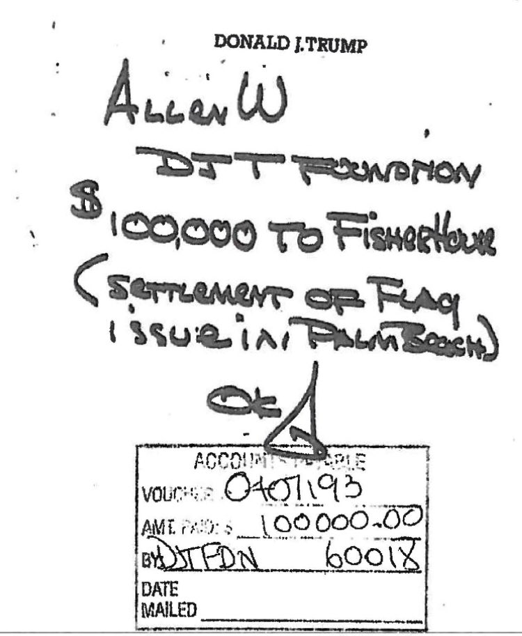 A: It was him. Here’s a note where Trump orders that $100K in charity money be used to pay off a legal settlement for his Mar-a-Lago Club.