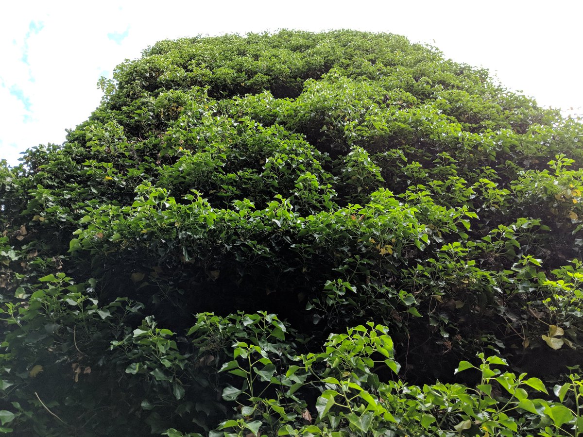 The church is easy to miss in the shaded woodland. It's completely covered in ivy, a mouldering ruin in the undergrowth between two fields.