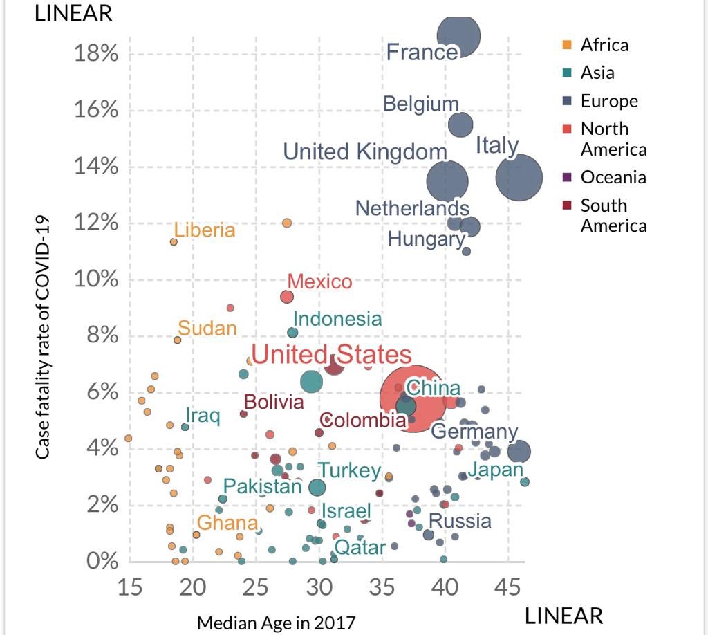 2. Sumbu datar dari grfik tersebut adalah median umur, sumbu tegak adalah CFR (case fatality rate), sedangkan besar kecilnya titik menunjukkan besar/kecilnya kematian di negara tersebut akibat infeksi Corona.
