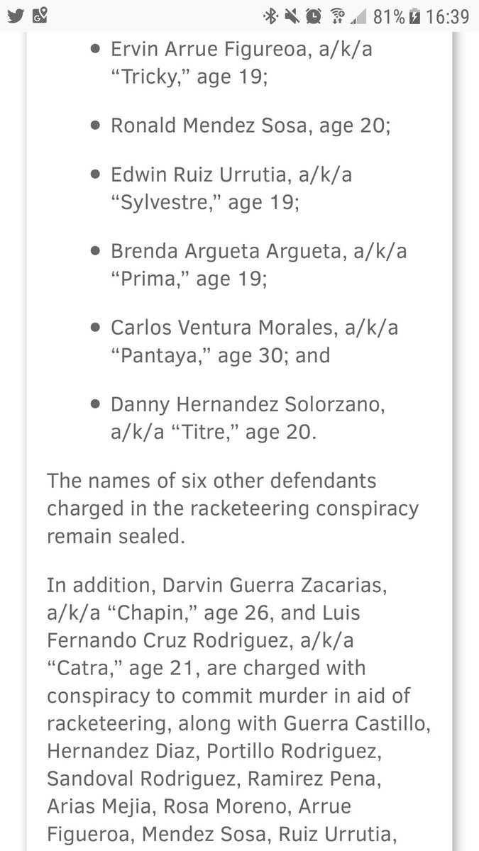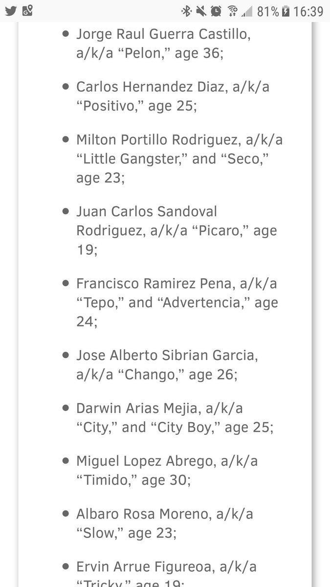 The six-count indictment alleges that from 2015 and continuing through 2017, MS-13 members and associates engaged in racketeering activity that included murders,