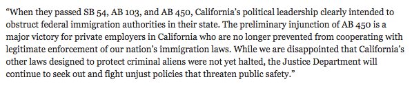 DOJ spox says they're "disappointed" with today's ruling rejecting most of the department's constitutional challenge to California's so-called sanctuary laws, but are pleased the judge struck down some of the limits on employer cooperation with the feds buzzfeed.com/zoetillman/a-j…