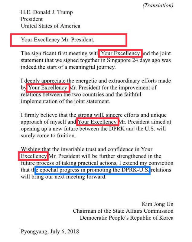 Kim uses flattery calling him his Excellency (5x-in pink below) and at no time reaffirming his commitment of total denuclearization, but insists the promotion of DPRK-US influential relations (in blue below) will continue.