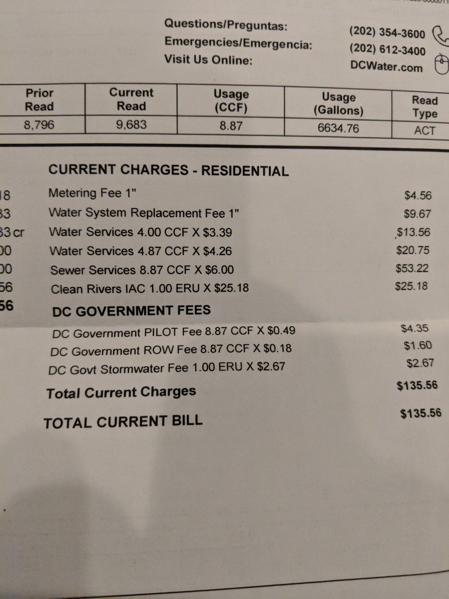Yes, I know about combined sewer overflow, and I love Rock Creek Park and the Potomac River, and I realized that much of the reason that the DC water bills are going up so much is the billions of dollars being spent to deal with that. But I still resent such a high water bill