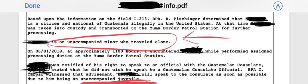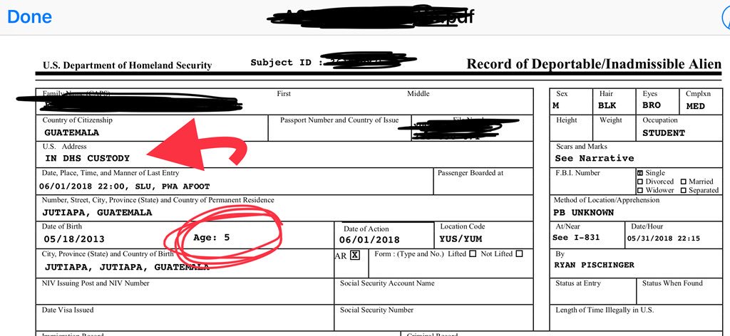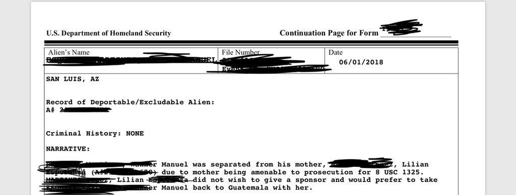 I represent a mom and 5 yr old boy-asylum seekers from Guatemala. I was able to obtain the report the border patrol agent wrote when he separated the 5 yr old from his mother. Many parts are redacted but take a look. The border agent wrote 5 yr old is in DHS custody...