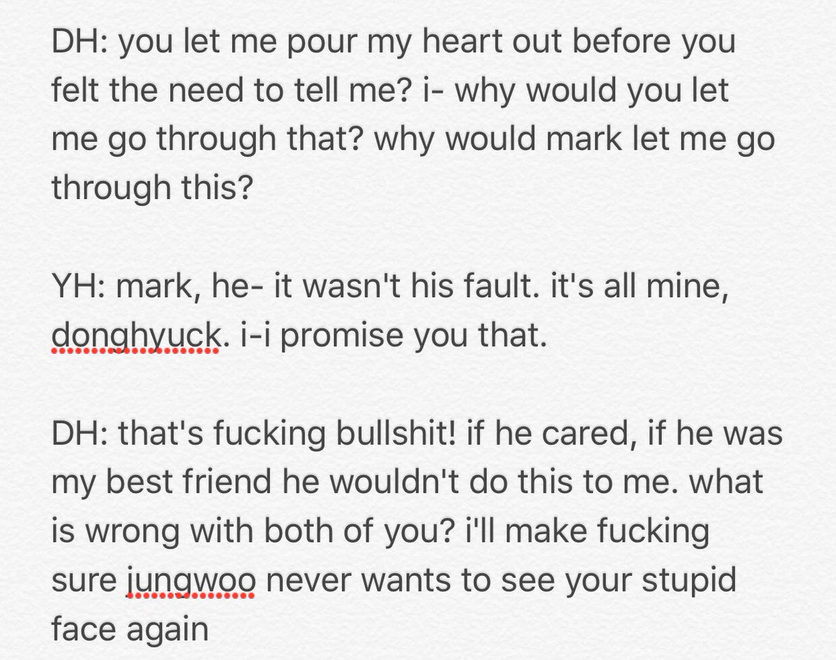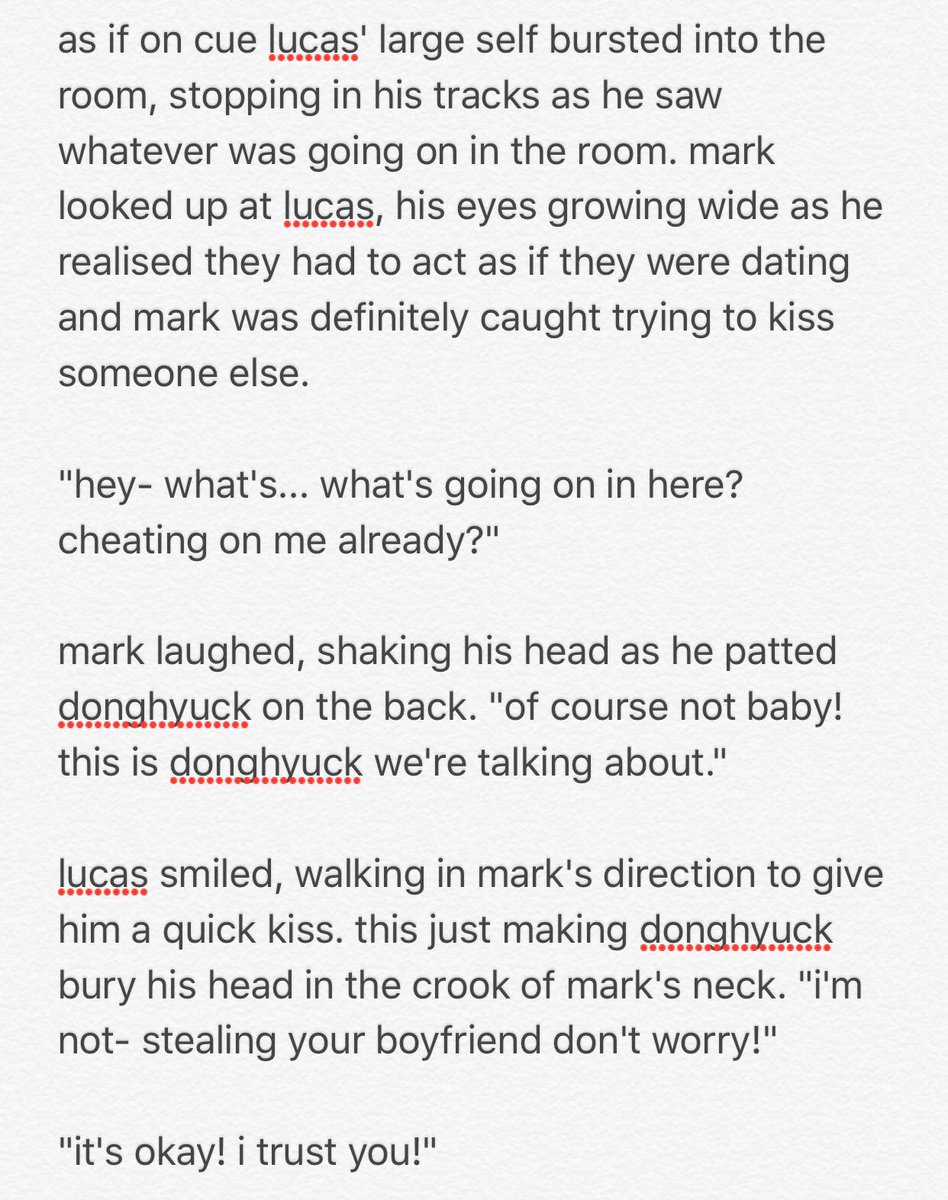 ㅡ when mark's best friend lucas fell in love with a third year, his logical next step was to force mark to fake date him. mark, being a good sport, complied, oblivious to his other best friend's huge crush on him