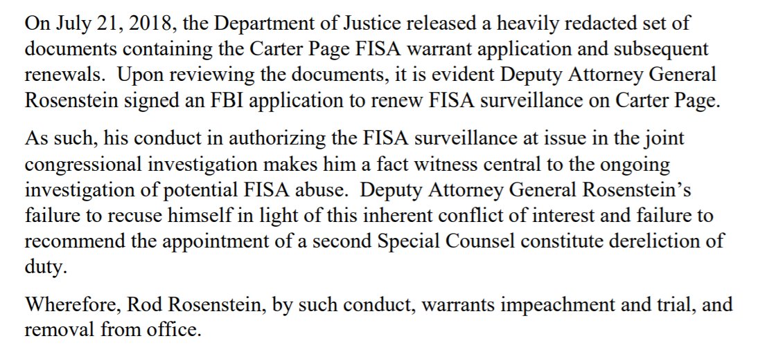 They also want to impeach him for the "potentially improper authorization" of FISA searches of the Trump campaign. Page left the campaign a month before the FBI got its wiretap order; by the time Rosenstein took office the campaign was over.