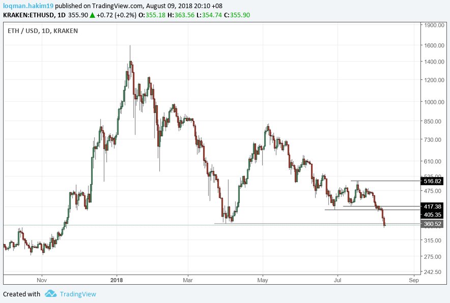Price bagi ETH/USD nampaknya sudah break support pertama dan kedua. Manakala support terakhir pada $360. Price sekarang ini masih didominasi oleh seller. Apa pandangan anda dengan keadaan terkini ETH/USD?