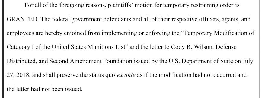 The temporary restraining order issued in the 3D printed gun case is pretty interesting because it doesn't appear to enjoin Cody Wilson, Defense Distributed, or the Second Amendment Foundation. Instead the order is enjoining the State Department. scribd.com/document/38514…