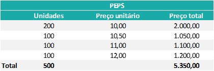 (4) No método primeiro a entrar, primeiro a sair (PEPS), as primeiras unidades compradas serão as primeiras a serem reconhecidas no custo. Dessa forma, o COGS do período será R$5.350,00 conforme a tabela #CFA
