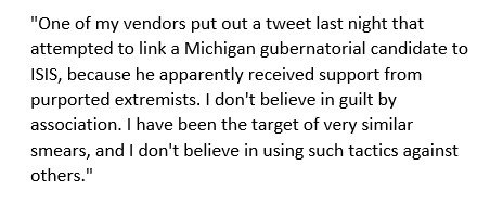 Corey Stewart's campaign sends me this quote from Stewart, who is claiming that the bigoted tweet from his account was tweeted not by him but by "one of my vendors."