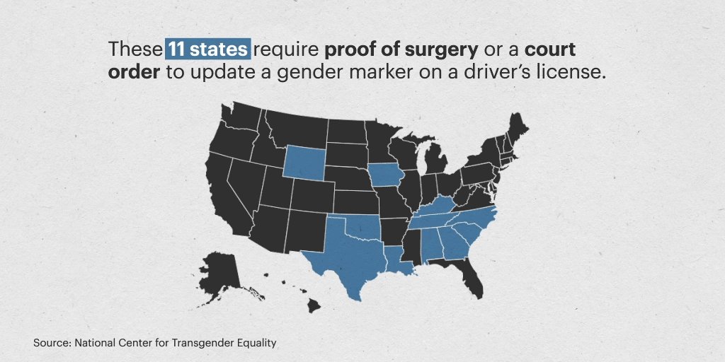 4/ Laws about updating a name or gender marker on an ID are inconsistent and confusing. In some states, trans people are required to have expensive surgeries or obtain a court order to update the gender marker on their ID.