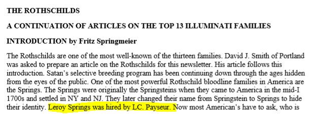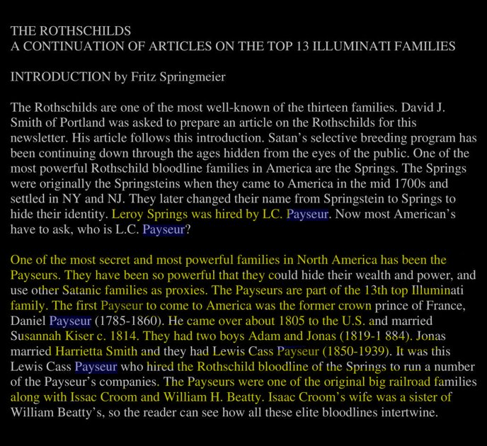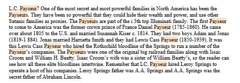 Follow the story as told by Springmeier. Notice how it's written "Payseurs & other families" signifying the importance of the family. Connected here to the Rockefeller's/ Payseur's own Standard Oil.