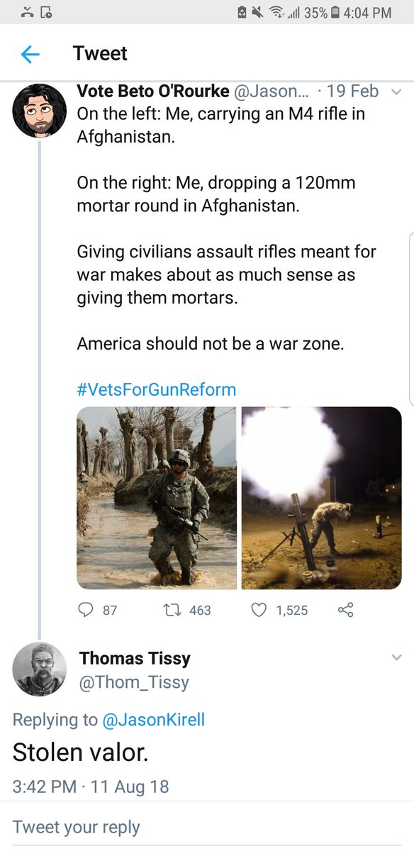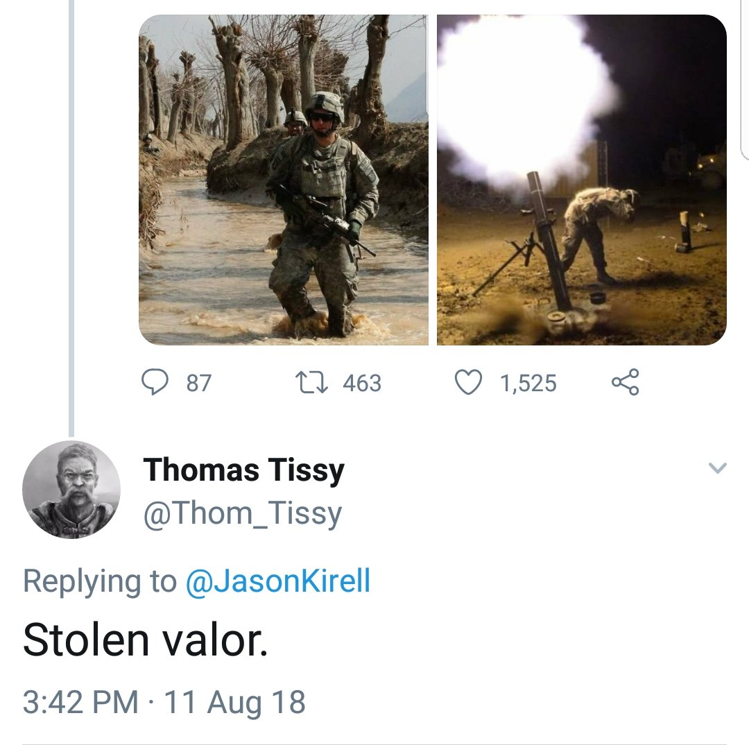 Accusing a combat vet of stolen valor under a photo of him in Afghanistan to own the libs.