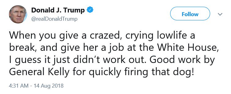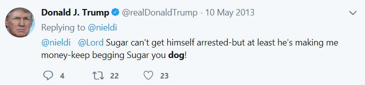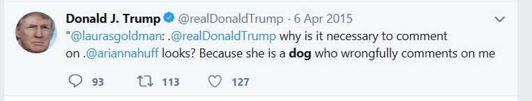 Trump usually tweets that people were "like a dog." The other people he's just flat called a dog are Arianna Huffington, Mac Miller, and, I think, British Apprentice host Lord Alan Sugar. #trumphistory