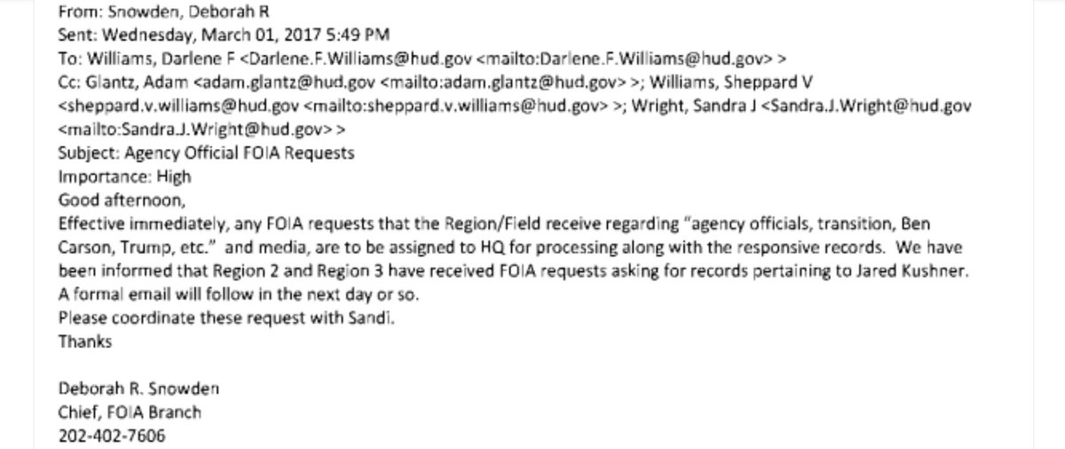 One email asked officials to route any requests regarding “agency officials, transition, Ben Carson, Trump, etc. and media” through HUD headquarters instead of the regional offices to which the FOIA requests were sent: documentcloud.org/documents/4310…