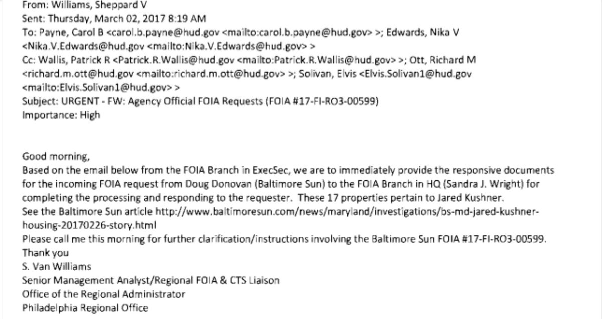 HUD officials' emails also mentioned that they had received FOIAs related to Jared Kushner's properties, including requests from the @BaltimoreSun: documentcloud.org/documents/4310…
