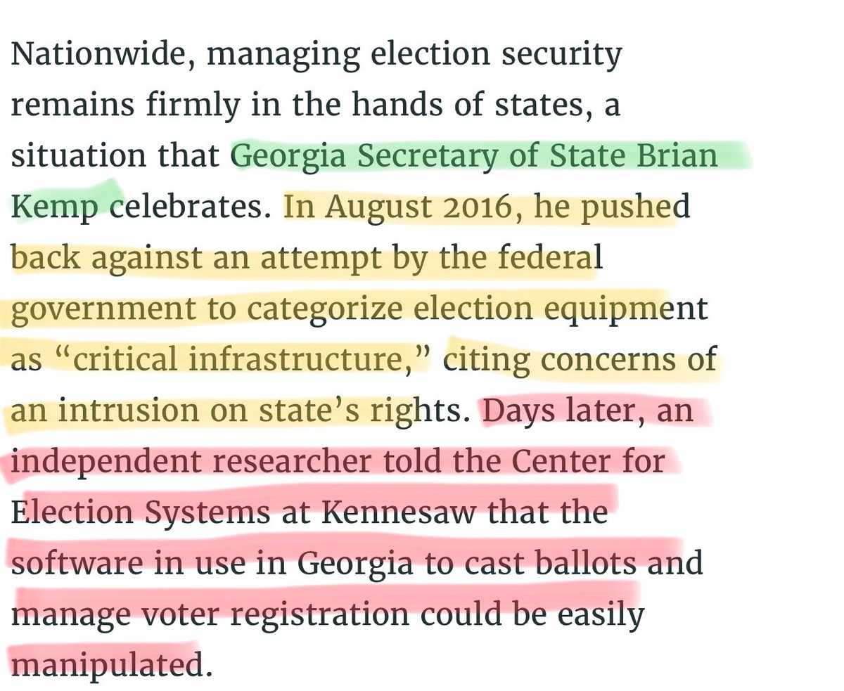 💥@BrianKempGA voted against designating election equipment as critical infrastructure because he wants State control of it. He knew that Georgia election equipment was vulnerable before 2016 election and did NOTHING💥 whowhatwhy.org/2018/08/06/geo…