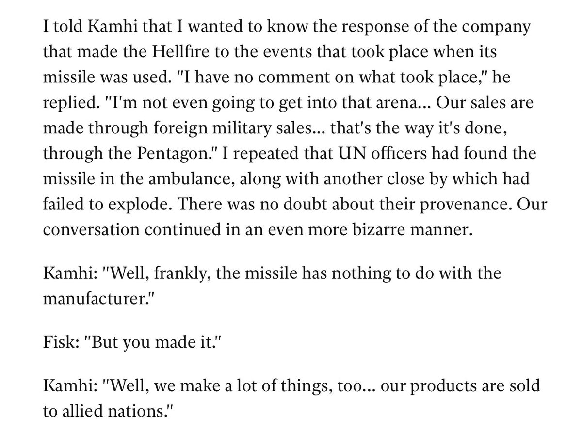 5. When Lockheed's top PR guy was asked about a Hellfire missile they'd made being used by Israel to massacre people in an ambulance in Lebanon, he memorably replied, "the missile has nothing to do with the manufacturer" independent.co.uk/arts-entertain…